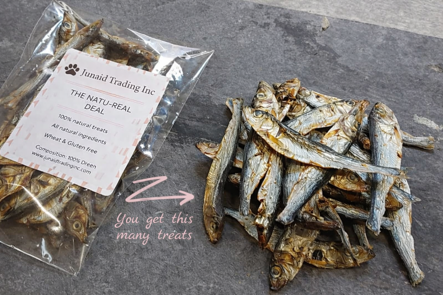 Treat your dog to a delicious, nutritious snack with Junaid Trading Inc Dried Fish Treats. These 100% natural, air-dried fish treats are high in protein and contain no artificial colours, flavours, or preservatives. Perfect for rewarding your dog, these treats are also wheat and gluten-free, making them suitable for sensitive dogs. Packed with essential nutrients like vitamins A, E, and D3, as well as minerals such as calcium, magnesium, and phosphorus, these fish treats contribute to healthy bones, a shiny coat, and overall well-being. Ideal as an everyday snack or special reward!