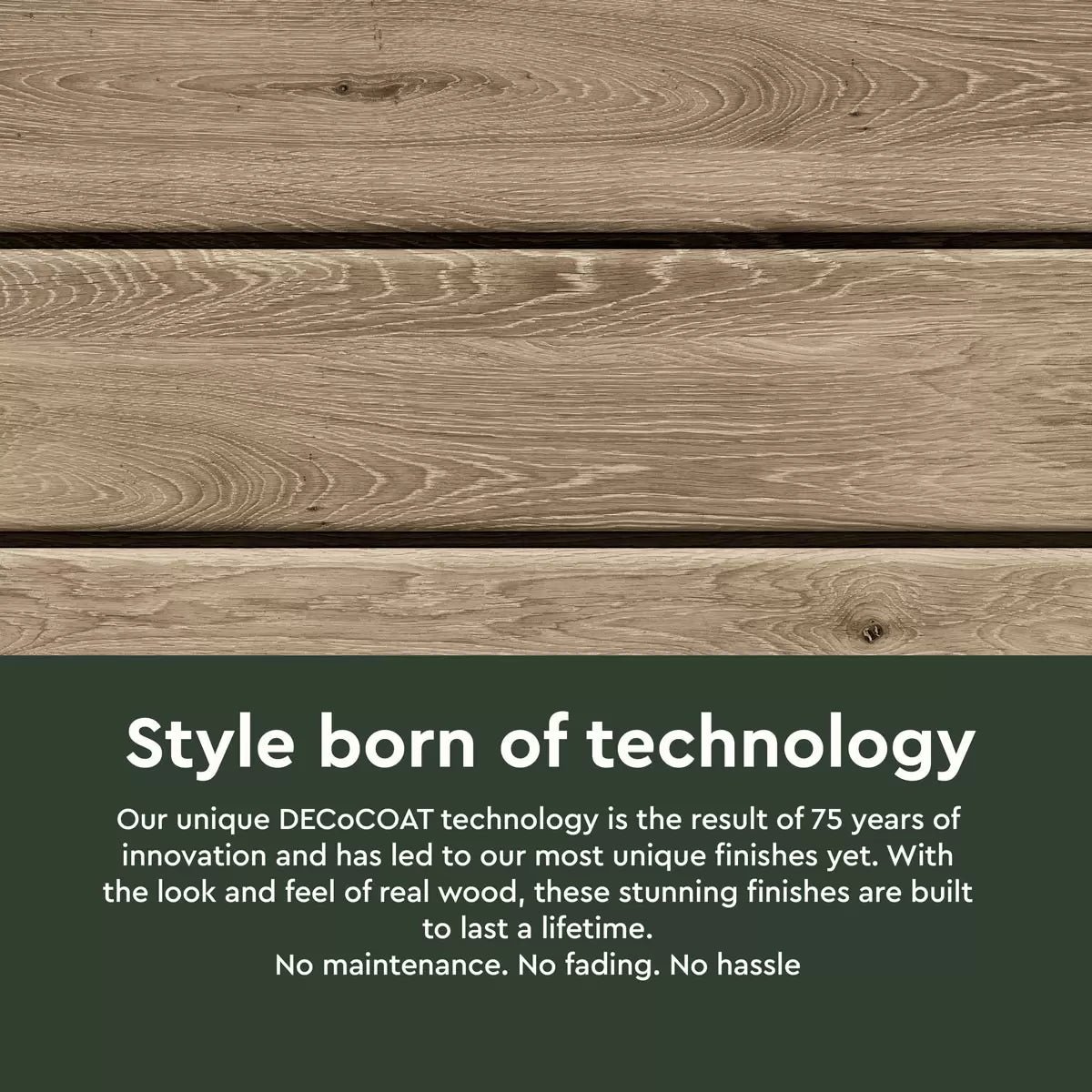 Made of innovative DecoCoat panels, for an elegant natural look that is weather-resistant and maintenance-free